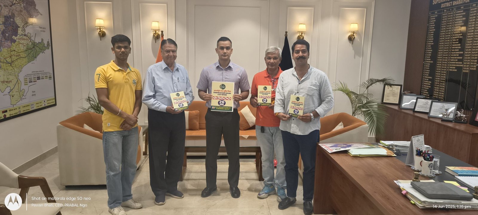 भरतपुर,14 जून। अंतरराष्ट्रीय नशा दिवस 26 जून के उपलक्ष्य में आयोजित किए जा रहे पखवाड़े के अंतर्गत जिला पुलिस अधीक्षक मृदुल कच्छावा द्वारा नशा मुक्त एवं राष्ट्र बनाने की प्रेरणा हेतु पुस्तिका का विमोचन किया।