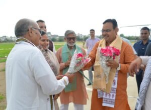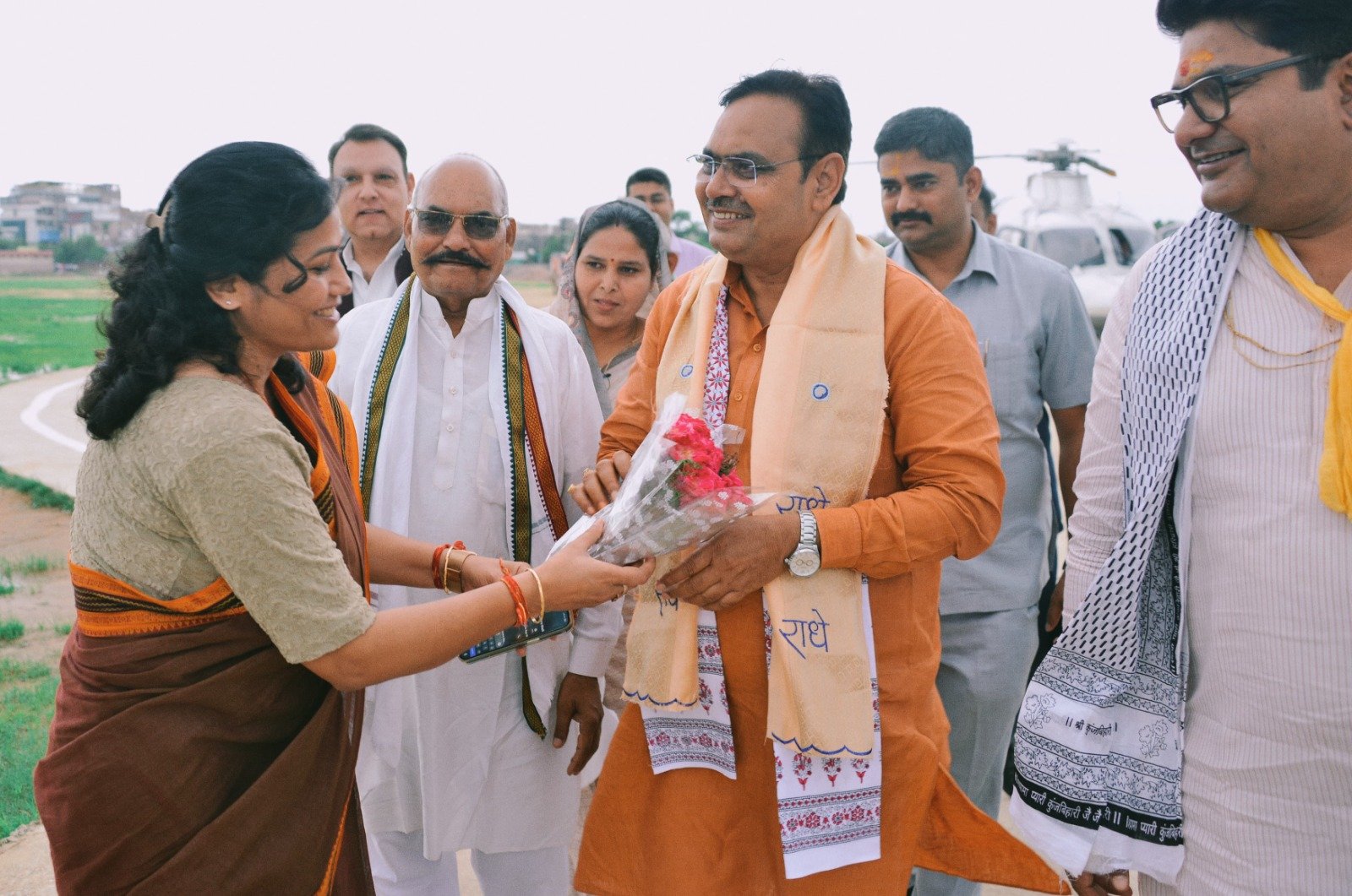 मुख्यमंत्री श्री भजनलाल शर्मा के भरतपुर पहुंचने पर एमएसजे कॉलेज मैदान में बनाये गये हैलीपेड पर संभागीय आयुक्त डॉ. टीना सोनी, पुलिस महानिरीक्षक राहुल प्रकाश, जिला कलक्टर कमर चौधरी, पुलिस अधीक्षक मृदुल कच्छावा, आयुक्त बीडीए कनिष्क कटारिया सहित प्रशासनिक अधिकारियों, जिलाध्यक्ष शिवानी दायमा सहित जनप्रतिनिधियों में अगवानी की। मुख्यमंत्री श्री शर्मा जवाहर नगर स्थित पैत्रक निवास पहुंचे जहां माता-पिता से मिलकर आर्शीवाद लिया।