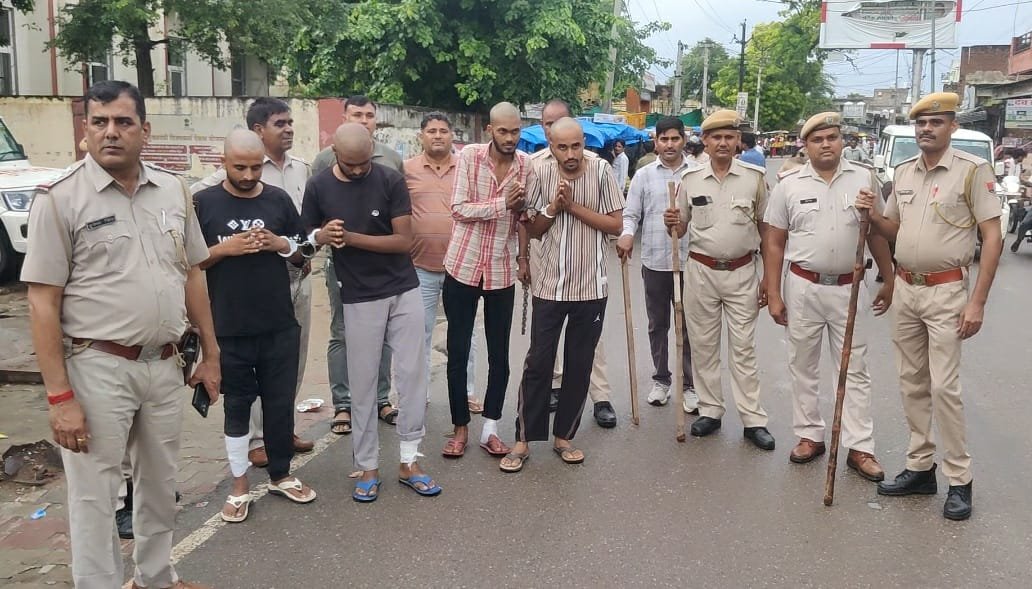 भरतपुर जिले के नदबई क्षेत्र के बैलारा गांव में बीते दिनों हुई फायरिंग से जुड़े मामले में पुलिस ने बड़ी कार्रवाई की है। पुलिस ने गिरफ्तार चार बदमाशों की शिनाख्त परेड कराई और सिर मुंडवाकर उन्हें पूरे बाजार में जुलूस के रूप में निकाला। इस दौरान बाजार में भारी भीड़ उमड़ी और लोग बदमाशों को देखकर आक्रोशित नजर आए।