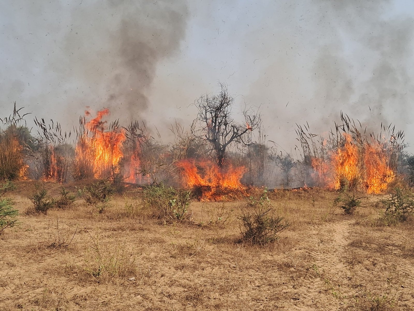 छात्र नेता कौशल फौजदार ने बताया कि रविवार को दोपहर बाद खेड़ली मोड़ थाना इलाके के गांव खान पुर वाछरेन हिंगोटा के आस पास बाण गंगा नदी के करीबन दो सौ बीघा इलाके में उगे पाला पूला तथा पेड़ो में अज्ञात कारण से आग जनी की सूचना मिली।
