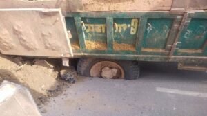 सड़क पर बड़ा हादसा होते-होते टल गया। मिट्टी से भरी एक ट्रैक्टर-ट्रॉली अचानक सड़क में धंस गई, जिससे मौके पर अफरा-तफरी मच गई।